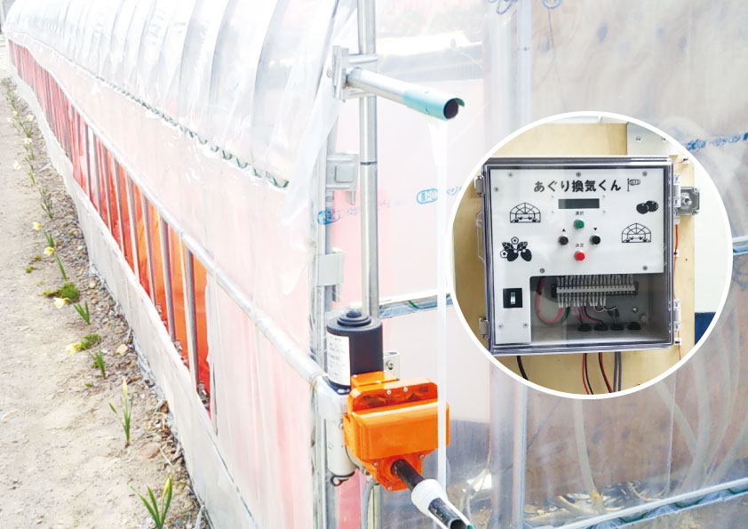 側窓自動換気システム あぐり換気くん:パイプハウスの自動サイド換気システムです。温度、雨、風(風速、風向)で制御可能です。