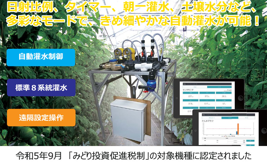 多目的 自動潅水施肥盤 あぐりウォーター:日射比例や土壌水分率等の潅水施肥制御が可能で、「みどり投資促進税制の対象機械に認定」されています。