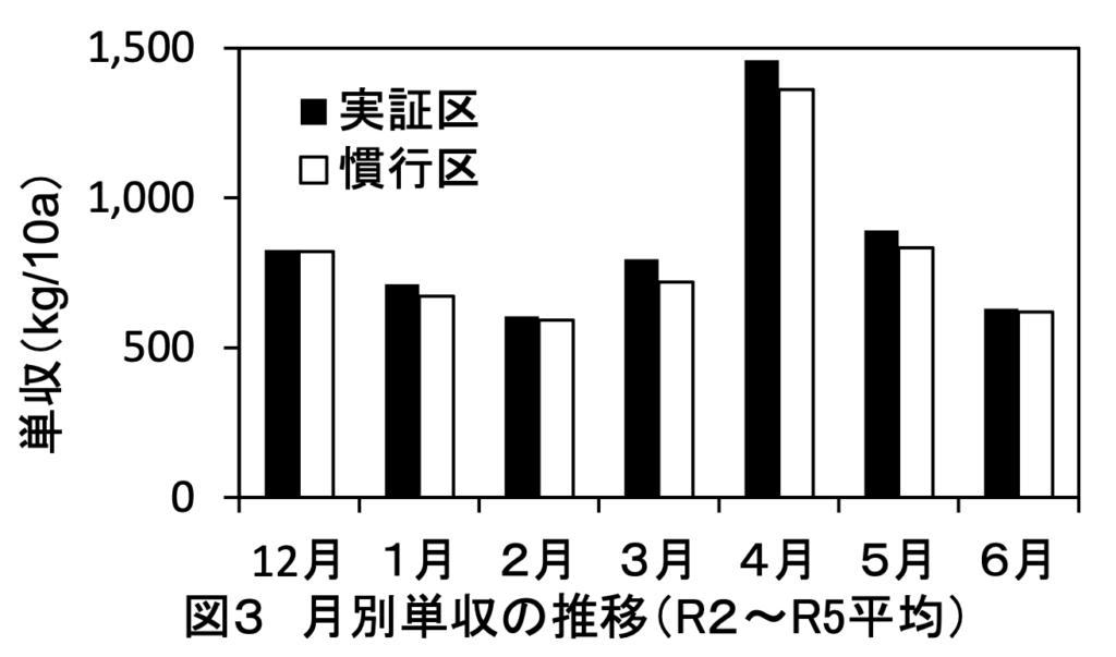 ○ 実証区の単収は、慣行区比で令和2年度は102%、令和3年度は104%、令和4年度は102%、令和5年度は101%であった。月別では3~5月が多かった(図3)。