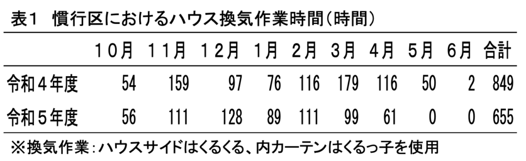 ○ 実証区では、換気作業の自動化により、手動による換気作業が不要となった(表1)。