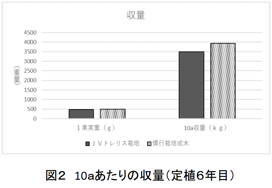 ○ 10 aあたりの収量は定植5年目(令和5年 )では、 3,239 kg (計算値)で、慣行栽培の成木3,660 kg (計算値)の88 の収量が得られた 。定植6年目(令和6年)では、3,494 kg (計算値)で、 慣行栽培の成木3,941 kg 計算値) の89 の収量 が得られた。