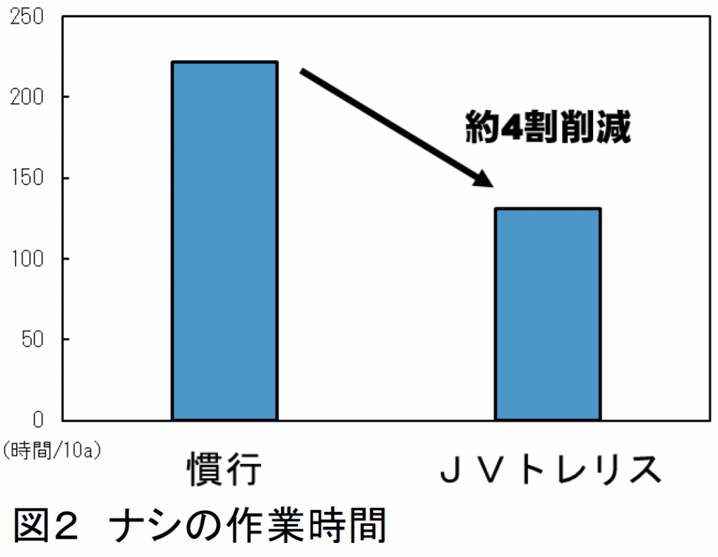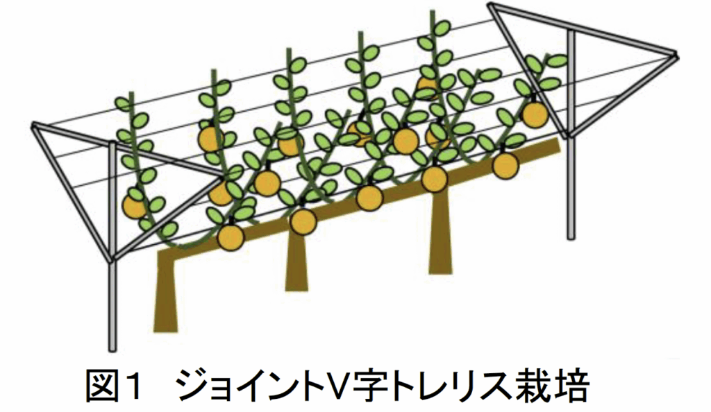従来の平棚栽培に比べて主枝を低くし、側枝を斜立させ、作業動線や作業姿勢を改善できる。ジョイントV字トレリス栽培は、従来の技術と比較して早期成園化と省力化が期待されている 。