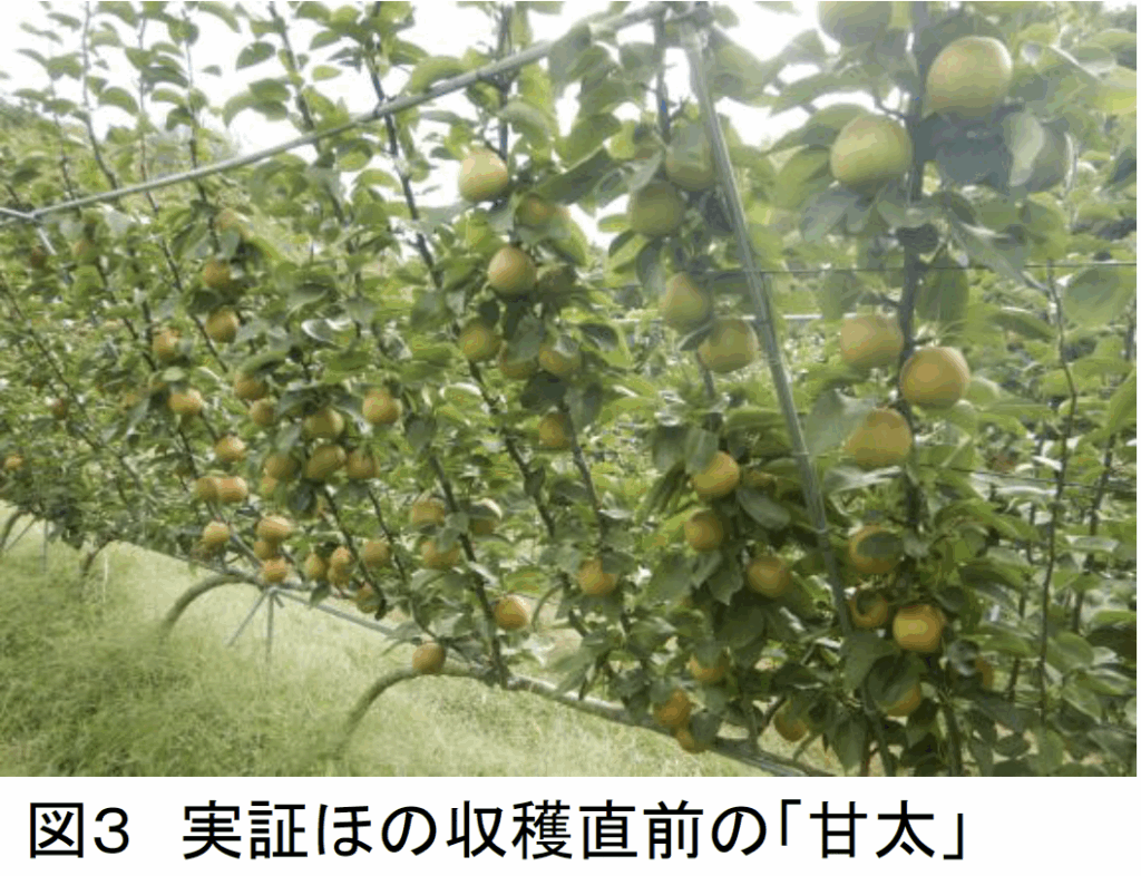 ○作業動線が直線状となり、摘果・収穫・せん定等の作業効率が向 上し、実証ほでは作業時間が4割程度削減した。