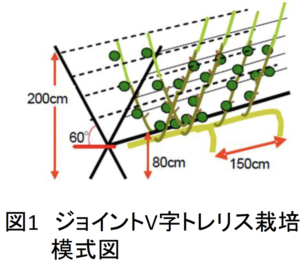 ジョイントV字トレリス栽培は、密植による早期成園化が図られる。 また、樹同士をつなぎ、一文字に主枝を配置するため、作業動線が単純に なり、かつ、樹冠をV字型にすることで、樹高が低くなり、作業姿勢が改善さ れるため、省力化及び軽労化が図られる。