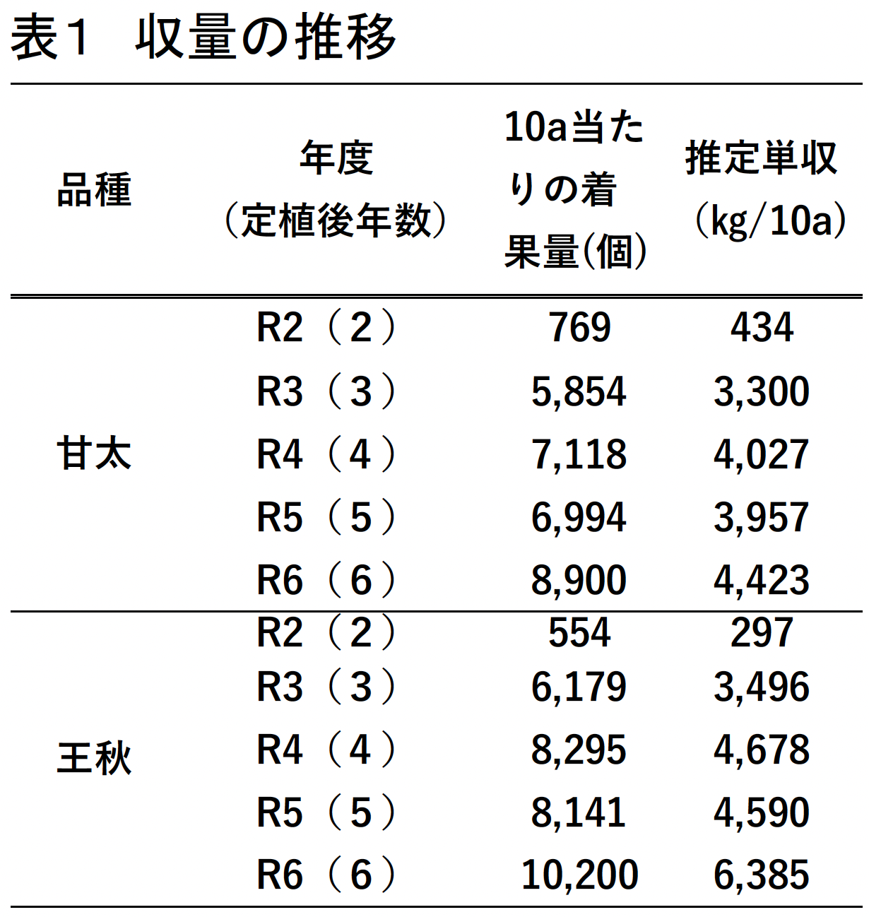 ○定植2年目に初収穫となり、定植3年目には慣行樹形の成園並 みの収量となった(表1)。