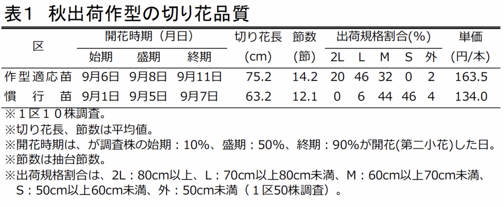 ○作型適応苗は慣行苗と比べて切り花長、 節数に優れ、上位出荷規格も多くなった。