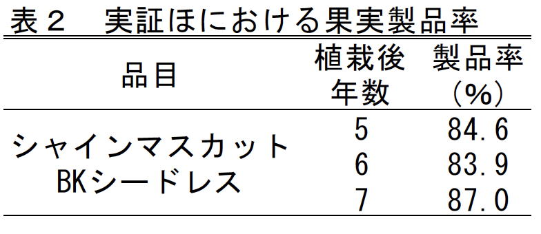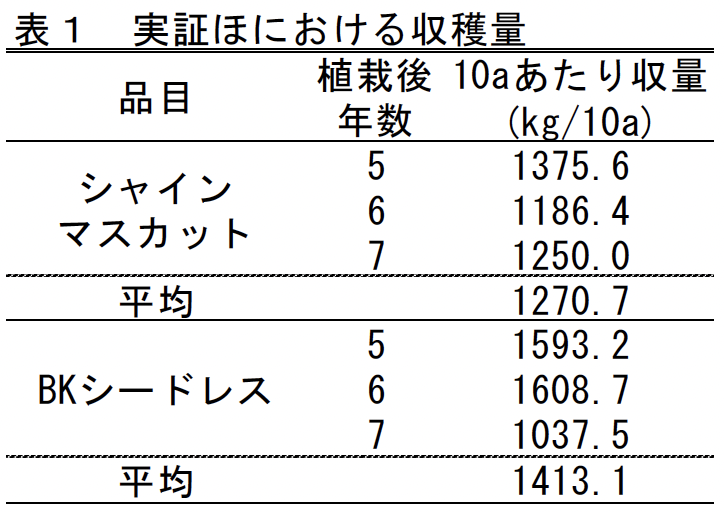 ○「シャインマスカット」の収穫量は昨年度減少したが、今年度は増加が見られ、平年並となった。「BKシードレ ス」は定植後7年目で減少したが、過去2カ年より減少したが、3カ年平均で1,000kg/10aを超えた(表1)。