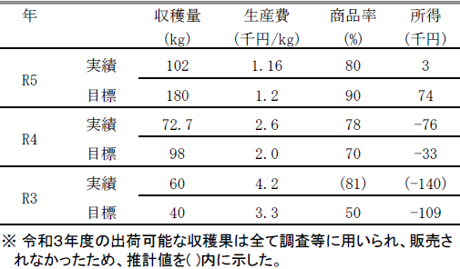 ○令和4年度以降「シャインマスカット」及び「BKシードレス」を直販(1,300円/kg)するとともに、導入経費が抑えられたため、所得が向上した(表1)。