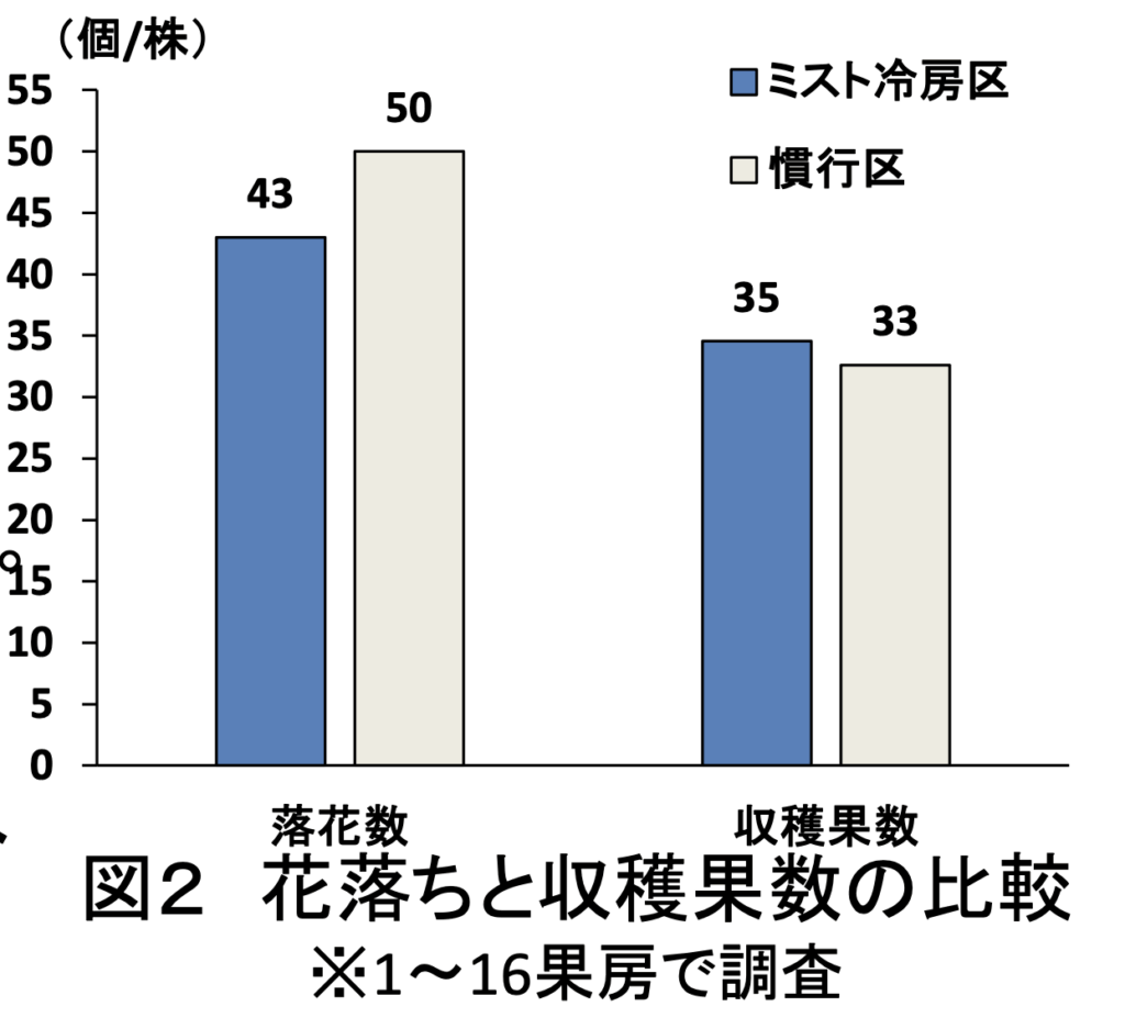 ○慣行と比比較して、花落数の減少や収穫果数の増加が確認できた(図2)。