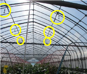 ○ 水分を気化させるためには、ミストノズルからきゅうりまで十分な距離がとれるとよい。軒高の低いハウスでは、距離を確保するのが難しい。