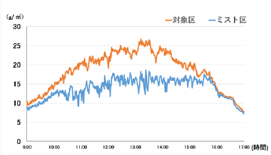 ○収穫前までの時期で特に効果が高く、晴天時、日中平均で気温が2.0~3.0℃低下した(図2)。また日中平均で飽差が4.6 ~5.3g/ ㎥低下し、乾燥状態が緩和された(図3)。