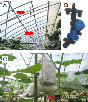 図1実証機材(A: ミスト 噴霧器(矢印)、 B :ミスト噴霧ノズル、 C 環境測定 装置)