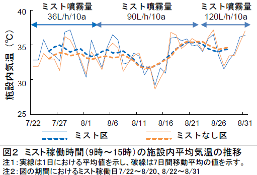 ○ミストの噴霧量 120L/h/10a の条件より少ない噴霧量では、高温抑制効果 が得られなかったため(図2) 、120L/h/10a を基準として栽培した場合の効果を確認する必要がある。