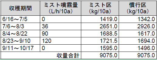 ○総収量 はミスト区、ミストなし区で同等だった 。なお、ミスト噴霧量 120L/h/10a の条件下 では、ミスト区の方が収量が多い傾向が見られた( 表1)