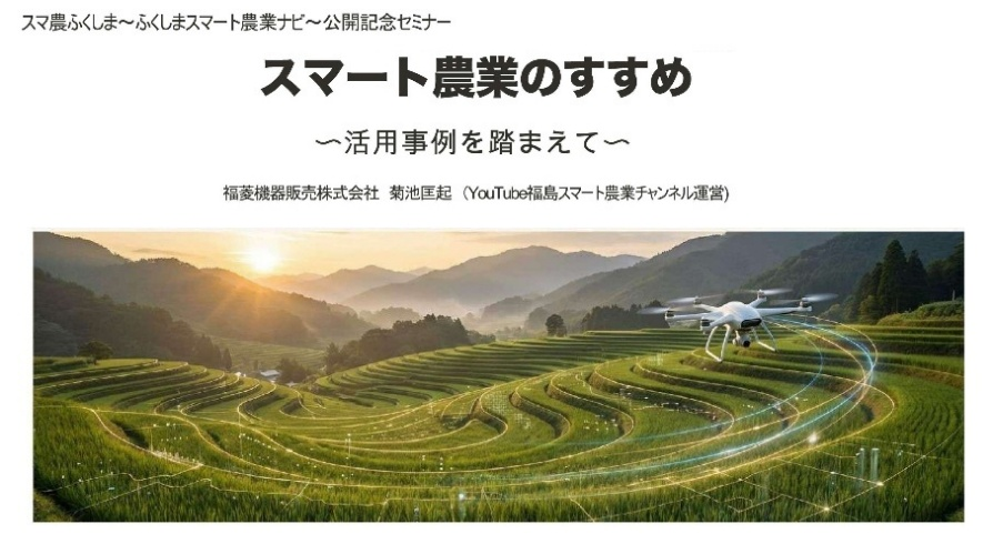 スマ農ふくしま ~ふくしまスマート農業ナビ~ の公開を記念し、福菱機器販売株式会社の菊池匡起代表取締役社長を講師に迎え、オンラインセミナーを開催しました。本セミナーはスマ農ふくしま会員限定でアーカイブ動画を公開(メルマガにて動画URL公開)していますので、そちらもぜひご覧ください。