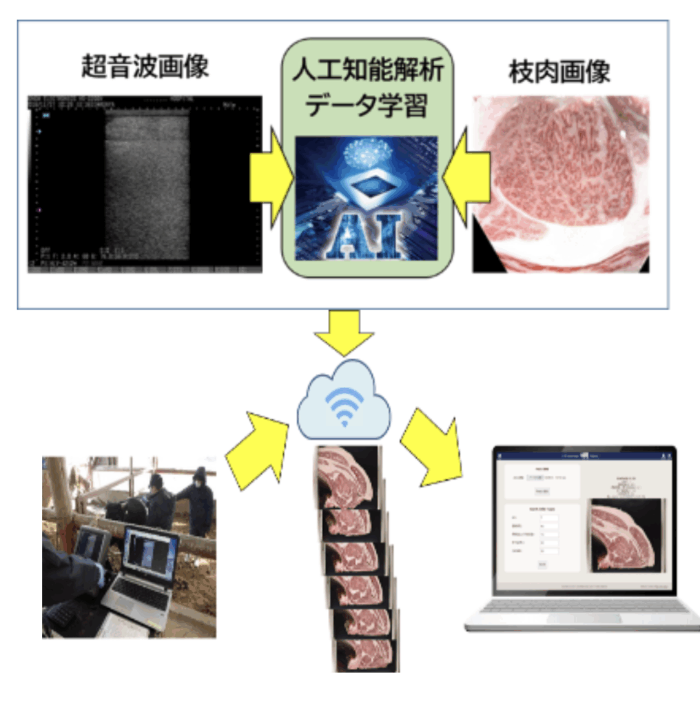 肥育牛生体の超音波画像と、と畜後の枝肉横断面の画像をAI(人工知能)に学習させ、成育途中の肥育牛の超音波画像から将来の枝肉横断面を推定できるシステム。