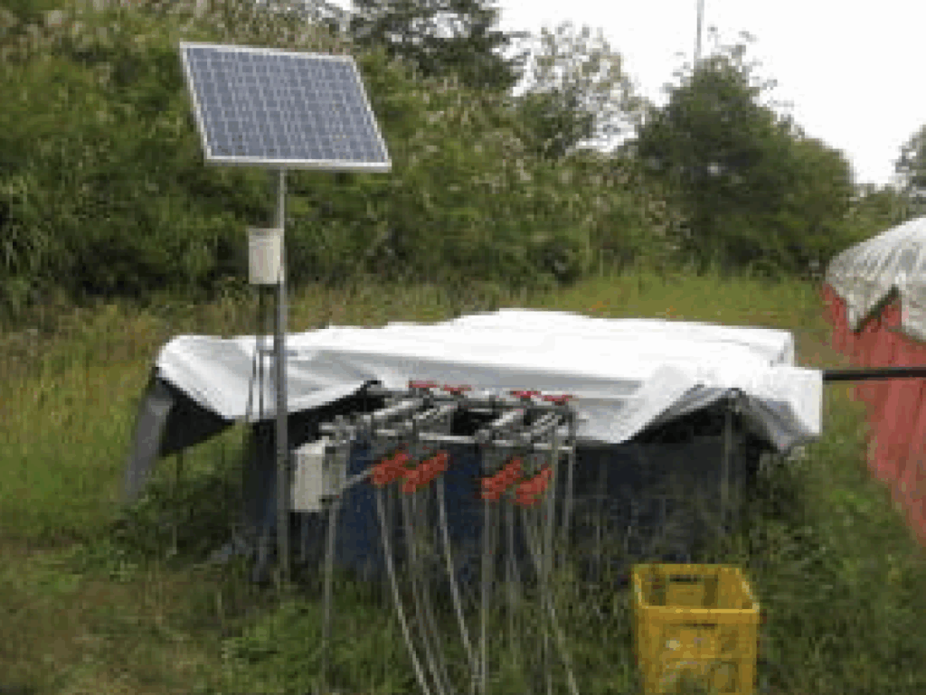 太陽光によりバッテリーが充電されるとプールに貯水した雨水を自動でくみ上げ、かん水するシステム